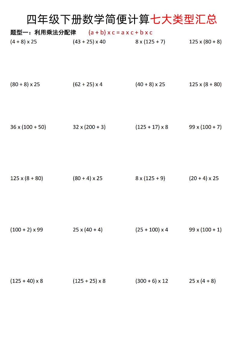 四年级下数学简便计算七大类型汇总